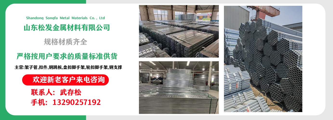 山東松發(fā)金屬材料有限公司主營(yíng)架子管,扣件,鋼跳板,盤(pán)扣腳手架,輪扣腳手架,鋼支撐生產(chǎn)廠家。本廠專業(yè)生產(chǎn)銷售?! 〗ㄖ眉茏庸堋?主要用于房建,橋梁,鐵路,公路,地鐵,水庫(kù),隧道,支撐?! 〖茏庸?扣件,鋼跳板,盤(pán)扣腳手架,輪扣腳手架,鋼支撐的優(yōu)越性及應(yīng)用“ ”產(chǎn)品因具有結(jié)構(gòu)簡(jiǎn)單合理、設(shè)計(jì)巧妙、使用方便、安全、快捷、易于運(yùn)輸、儲(chǔ)存、維護(hù)簡(jiǎn)單等特點(diǎn)?! 」疽回瀳?jiān)持“質(zhì)量,用戶至上,優(yōu)質(zhì)服務(wù),信守合同”的宗旨,憑借著高質(zhì)量的產(chǎn)品,良好的信譽(yù),優(yōu)質(zhì)的服務(wù),產(chǎn)品暢銷全球。歡迎廣大客戶來(lái)電洽談,共同發(fā)展,共創(chuàng)輝煌! 山東松發(fā)金屬材料有限公司秉承誠(chéng)信服務(wù)、恪守信譽(yù)的宗旨,在同等的質(zhì)量下,保證以最低的價(jià)格,最完善的服務(wù),最高的信譽(yù)來(lái)答謝各界朋友的支持和厚愛(ài),歡迎您的來(lái)電、咨詢,我們將竭誠(chéng)為您服務(wù)!...